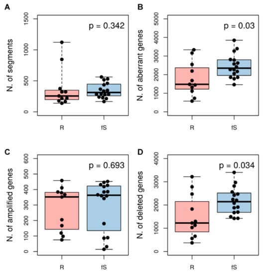 We used sCNA data to obtain a measure of genomic instability for each patient, using different approaches all based on the GISTIC algorithm. We firstly considered the number of regions with different copy number (number of segments; Figure 3A), with the assumption that a higher number of segments should describe a more fragmented (instable) genome. We next considered within each sample either the total number of genes affected by sCNA (Figure 3B) or, separately, the total number of amplified or deleted genes (Figure 3C,D). Overall, we observed a trend for higher sCNA in fS compared to R patients. This trend was significant when we considered the number of genes affected by aberrations in general (Wilcoxon rank-sum test p-value = 0.03) and this difference was mainly driven by deletions (Wilcoxon rank-sum test p-value = 0.034).