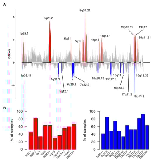 - Mermel, C.H.; Schumacher, S.E.; Hill, B.; Meyerson, M.L.; Beroukhim, R.; Getz, G. GISTIC2.0 facilitates sensitive and confident localization of the targets of focal somatic copy-number alteration in human cancers. Genome Biol. 2011, 12, R41. [Google Scholar] [CrossRef] [PubMed]