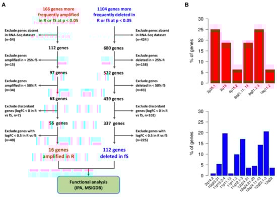 The complete decision tree for gene selection is shown in Figure 5A. We first removed genes that were not assessed by RNA-Seq from the list of 1270 genes significantly amplified or deleted in R or fS patients. We next filtered this list according to the observed relative frequency of amplification or deletion for each sensitivity class. Finally, we removed genes whose log2 fold change (FC) was not compatible with its copy number status (e.g., a gene preferentially amplified but down-regulated in R group) and among the concordant genes we selected those with a log2 FC of at least 0.5 between R and fS patients. The final gene list included 128 genes (Table S7), consisting of 16 genes preferentially amplified and up-regulated in R group and 112 genes more frequently deleted and down-regulated in fS patients. The relative frequency of associated altered cytobands is reported in Figure 5B. Interestingly, these cytobands were not included among the significantly recurrent aberrant regions identified by GISTIC.