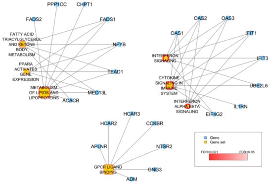 To map the 128 altered genes into known functional pathways we firstly assessed over-representation of Reactome canonical pathways included in the C2 gene set collection of MSiGDB. Seven gene sets, related to interferon (IFN) and cytokine signaling, fatty acid and lipid metabolism, were found significantly over-represented (FDR < 0.05) and 23 out of the 128 genes overlapped with at least one of them (Figure 6).