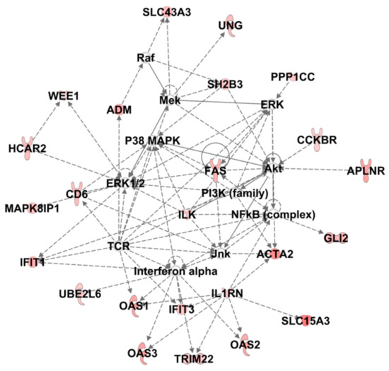 The top-scoring Network (Dermatological Diseases and Conditions, Organismal Injury and Abnormalities, Immunological Disease) whose graphical representation is reported in Figure 7, shows a number of molecular relationships centered on interferon, in accordance with previously described pathway analysis. Interestingly, among the top regulatory networks we also identified a number of networks whose functions are mainly related to cell growth and proliferation and cell development. Accordingly, Cellular Development, Cell Morphology, Cellular Growth and Proliferation were the most significantly modulated Molecular Cell Function (Table S8), while Invasion, Migration and Cell Movement were the only Disease and Functions significantly predicted to be increased in R patients (Table S9).