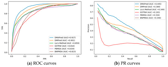To confirm that the proposed method has a superior performance in predicting potential miRNA candidates associated with diseases, we compared DMAPred with Liu’s method [22], DMPred [35], PBMDA [29], GSTRW [36], and BNPDMA [37], which are state-of-the-art prediction methods for miRNA-disease associations. Liu et al. integrated the similarities and associations between miRNAs and diseases to propose a method of random walks with a restart in a heterogeneous miRNA-disease network to predict the association score between a miRNA and a disease. You et al. proposed a method, PBMDA, based on the path to predict the likelihood of a miRNA association with a disease. This method not only integrates the similarity of miRNA functions and the semantic similarity of diseases, but also considers the similarity of the Gaussian interaction spectrum between miRNAs and diseases. Xuan et al. proposed DMPred, based on non-negative matrix factorization, to predict the associations between miRNAs and diseases taking into account the sparse nature of miRNA disease associations. Chen et al. proposed a method, called GSTRW, that calculates the global similarity of a network and predicts the association between a miRNA and a disease by performing random walks in miRNA and disease similarity networks, respectively. BNPDMA uses a bipartite recommendation algorithm to predict potential disease-associated miRNAs by assigning bias ratings to the associations between miRNAs and diseases.