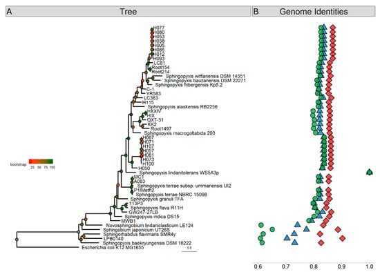 Phylogenetic analyses of Sphingopyxis genomes. (A) Phylogenetic relationship of Sphingopyxis genomes based on a maximum likelihood analysis of 400 conserved protein sequences. Branches are colored according to bootstrap values, which are presented on the nodes. The bar represents 0.8 substitutions per site. The WS5A3p branch is indicated with a blue diamond. The blue shaded box contains outgroup genomes included in the analysis. (B) Sequence similarity of analyzed Sphingopyxis genomes comparing to WS5A3p strain based on ANIb (blue triangle), ANIm (red diamond) and AAI (green circle).