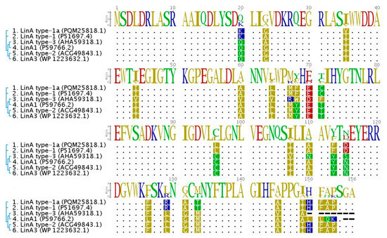 Protein sequences of lindane upper degradation pathway proteins LinA and LinB are characterized by a high level of polymorphism and this alters their enantio- and stereoselectivity [71]. Sequences of Lin proteins identified in WS5A3p are almost identical to those from the archetypal strain UT26. The most differentiated in amino acid composition is an enzyme from the γ-HCH upper degradation pathway— LinA (named here LinA type-1a), which shows 98.7% identity with a LinA type 1 (also described as LinA2) [12] that was described to be more efficient in γ-HCH degradation than LinA1 from S. indicum B90A [72] to which it has a 90.3% identity (Figure 4). Also, three other variants of the LinA protein have been proposed in the literature [16,73,74,75]. To distinguish them, we use the nomenclature LinA3 (from Sphingobium sp. HDIPO4) and LinA type-2 and LinA type-3 (from the soil metagenomes). Their identities with WS5A3p LinA type-1a protein are 93.6% and 86.6%, respectively. LinA type-1a protein has conserved D25 and H73 residues necessary for its specific enzymatic activity. It differs from LinA type-1 and type-3 by A23G and I35V, which is unique for WS5A3p. While G23 is involved in protein thermostability [16], V35 have not been yet identified as accountable for specific protein features and need to be further investigated. Other LinA type-1a residues are the same as in LinA type-1. Based on the presence of K20, L96, and A131 residues we can predict that LinA type-1a will exhibit preference to the (−) enantiomers [76].