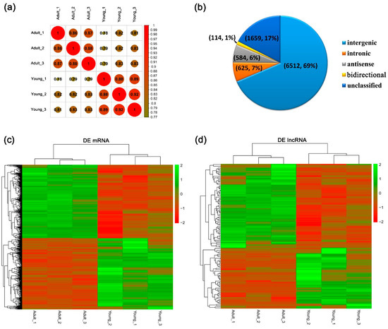 The expression levels of all transcripts were used for the correlation analysis of both samples to evaluate the reliability of our data. High correlation was detected (r > 0.86), indicating the high reproducibility of the utilized method (Figure 1a). The sequencing data were used for mRNA and lncRNA analyses.