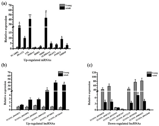 Validation of differentially expressed mRNAs and lncRNAs by qRT-PCR. (a–c) Expression patterns of ten upregulated mRNAs, six upregulated lncRNAs, and eight downregulated lncRNAs in adipose tissues of young and adult buffalos. The RNA expression levels are normalized to those of GAPDH. Comparison was analyzed by Student’s t test or nonparametric test. Data are presented as mean ± SD (n = 3, *, p < 0.05, **, p < 0.01).