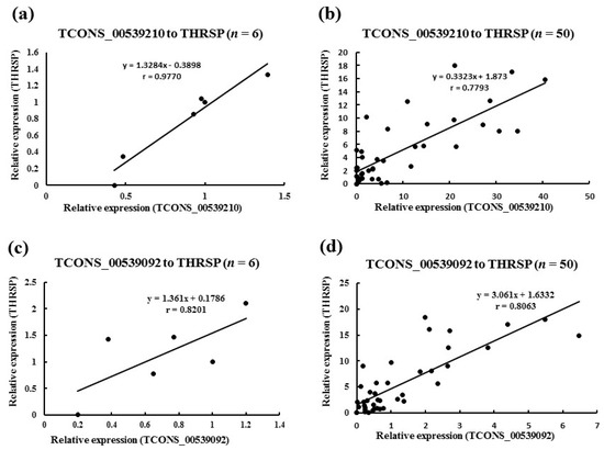 To evaluate the reliability of the coexpression analysis, five mRNA–lncRNA pairs with potential effect on fat deposition were selected for validation via qRT-PCR. These included three pairs for the THRSP gene, one pair for the peroxisome proliferator-activated receptor alpha (PPARA) gene, and one pair for the LPL gene (Table 1). Firstly, six adipose tissue samples of young (n = 3) and adult (n = 3) buffalos were used. Only three pairs with high correlation (r > 0.8) were then used for the second validation experiment by using 50 adipose samples of buffalos with variable months of age. Finally, only two pairs with relatively high correlations obtained: the TCONS_00539210-THRSP had r = 0.78 and the TCONS_00539092-THRSP had r = 0.81 (Table 1 and Figure 3).