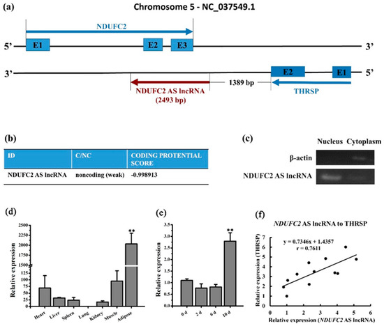We further focused on the mRNA–lncRNA pair with the highest correlation value, TCONS_00539092-THRSP. TCONS_00539092 is a lncRNA transcribed from the NDUFC2 antisense strand and we named it NDUFC2-AS lncRNA (Figure 4a). Meanwhile, NDUFC2-AS lncRNA is located 3′-downstream of THRSP in genome (Figure 4a). The full-length of NDUFC2-AS lncRNA is 2493 bp (Table S1). The CPC [18] indicated that NDUFC2-AS lncRNA is a noncoding RNA (Figure 4b). The semiquantitative PCR of nuclear and cytoplasmic fractions showed that NDUFC2-AS lncRNA is mainly localized in the nucleus of adipose tissue (Figure 4c). Tissue expression profile demonstrated that NDUFC2-AS lncRNA is mainly expressed in adipose tissue (Figure 4d). During adipocyte differentiation, NDUFC2-AS lncRNA is significantly upregulated in day 10 (Figure 4e, p < 0.01). NDUFC2-AS lncRNA and THRSP showed relatively high expressional correlation during differentiation of buffalo adipocytes (Figure 4f).