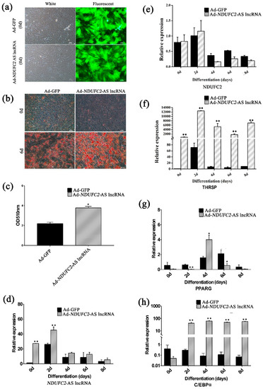 To detect the effect of NDUFC2-AS lncRNA on lipid accumulation in buffalo adipocytes, the full-length of NDUFC2-AS lncRNA was inserted into the pHBAd vector and packaged into adenovirus for overexpression (Ad-NDUFC2-AS lncRNA). The GFP was used as indicator for the recombinant adenovirus. GFP was highly expressed two days after adenoviral transduction (Figure 5a). The expression of NDUFC2-AS lncRNA in the Ad-NDUFC2-AS lncRNA group was significantly higher than that in the Ad-GFP group (Figure 5d). With overexpressed NDUFC2-AS lncRNA, THRSP and C/EBPα were significantly upregulated (Figure 5f,h). The expression of PPARG was significantly upregulated on day 4 but significantly downregulated on days 2 and 6 (Figure 5g). For NDUFC2, no significant difference was found between the two groups (Figure 5e). Compared to the Ad-GFP group, lipid accumulation was significantly increased in Ad-NDUFC2-AS lncRNA group (Figure 5b,c) in the sixth day of induced differentiation (p < 0.05).