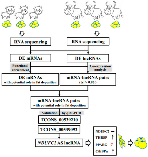 This is the first report that presents a characterization of lncRNAs based on RNA sequencing data during the development of adipose tissue in the buffalo. This study demonstrates that: (1) a large number of lncRNAs are expressed during the development of buffalo adipose tissue, most of which are intergenic lncRNAs; (2) 124 lncRNAs demonstrate differential expression during both development stages; (3) 74 lncRNAs show high expressional correlation with genes involved in fat deposition; and (4) NDUFC2-AS lncRNA promotes lipid accumulation in buffalo adipocytes. The central idea and results of this research are illustrated in Figure 6.