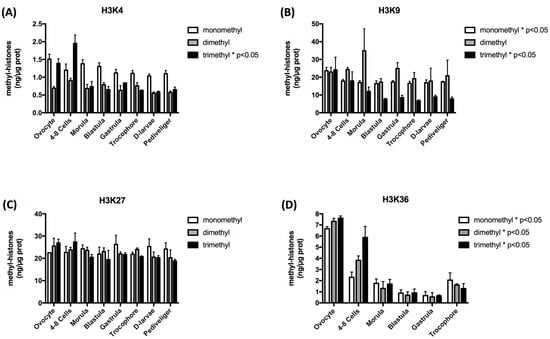 The amount of methylation of histone H3 lysine 4, 9, 27, and 36 residues was observed to be in the same range overall, from ca. 0.5 to ca. 30 ng methyl histone/µg protein. However, some variations in the patterns of mono-, di- and tri-methylations could be observed across developmental stages, depending on the histone lysine residue and the number of methyl groups considered. Indeed, H3K4me1 and H3K4me2 remained stable whereas H3K4me3 decreased significantly after a maximum level observed in 4–8 cell embryos (p < 0.05). H3K9me1 and H3K9me3 also displayed a significant decrease, which was more marked up to the blastula stage and then remained stable. Finally, the global level of methylation on H3K36 also decreased especially until the blastula/gastrula stages before an increase in the trocophore stage. In contrast, no significant variation could be detected in the level of the methyl marks on H3K27 (Figure 1).