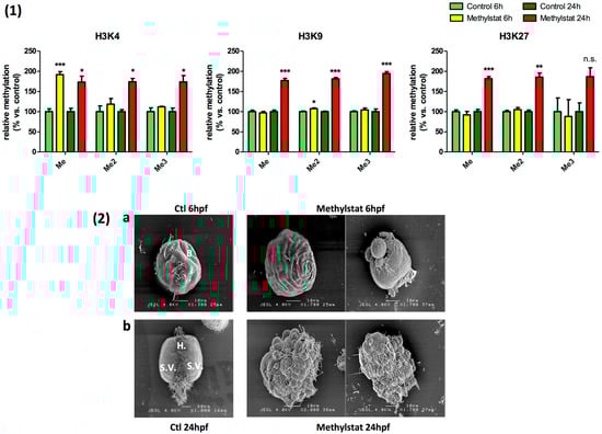 (1) Hypermethylation of histone lysine residues in presence of 10 µM Methylstat. Global H3K4 methylation increase in presence of methylstat, but only H3K4me1 and H3K4me3 are significant. Global H3K9 methylation increase in presence of methylstat, but only H3K9me2 is significant. H3K27me and H3K27me2 increase in presence of methylstat. Asterisk in the legend indicates significant variation of the indicated mark (One-way ANOVA; p < 0.05 was considered significant (<0.05 (*), <0.001 (**), <0.0001 (***)). (2) Abnormal development. Different phenotypes observed in control condition and under methylstat treatment at 6 h after fertilization (a) and 24 h after fertilization (b).