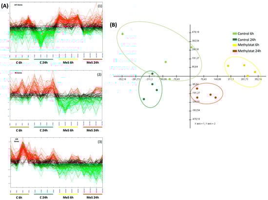 Sixteen pools of embryos, from control (4 control-6 h, 4 control-24 h) and Methylstat treated (4 methylstat-6 h, 4 methylstat-24 h) conditions, were used to perform a microarray experiment. After analysis of the microarray results with TMeV 4.6.0 software [,], a two factor ANOVA (time (6 and 24 h) and treatment (control and Methylstat 10−5 M)) with a p-value based on permutation (1000) of 0.05 and an α correction identified that 376 out of 31,918 analyzed ESTs were statistically differentially expressed between controls and treated animals. Hierarchical clustering using Pearson’s correlation grouped the 16 sample pools according to the treatment and the developmental time (data not shown). Biological interpretation of the data led us to group these clusters into 3 major gene expression profiles using K means clustering of genes according to similar expression patterns using Pearson’s correlation (Figure 3A). (I) Overexpressed genes in MeS-treated animals (147 genes, 39%, cluster 1) (Figure 3(A1)); (II) underexpressed genes in MeS-treated animals (90 genes, 25%, cluster 2) (Figure 3(A2)); (III) underexpressed genes in MeS-treated 6 hpf animals (139 genes, 37%, cluster 3) (Figure 3(A3)). The list of genes within each cluster is provided in supplementary data (Tables S2–S4). A Principal Component Analysis (PCA) was applied to all 376 genes of the sixteen sample pools (4 control 6 h, 4 control 24 h, 4 methylstat 6 h, 4 methylstat 24 h) to assess internal consistency of the whole transcriptional dataset and verify that the main variation in gene expression correspond specifically to treatment (Figure 3B). The first three Principal component (PCs) explained 58.5% of the total variance. The score plot obtained using the three first PCs is shown in Figure 3B. In this plot, similar transcriptional profiles cluster together, whereas significantly different samples appear more distant from each other. We observed a clear clustering of the different treatments and developmental times determined by microscopy and/or histone methylation pattern upon Methylstat treatment.