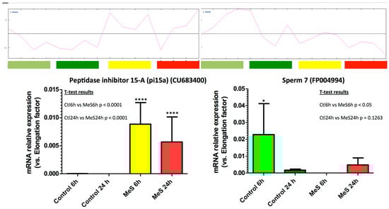 RT-qPCR measurements of mRNA expression of selected marker genes from the different clusters. Examples of cluster 1 (Peptidase inhibitor 15-a (pi15a) (CU683400), overexpressed in MeS treatment) and cluster 2 (Sperm7 (FP004994), underexpressed in MeS-treated 6hpf animals) are shown. For each transcript, a student’s T tests (p < 0.05 was considered significant) has been used to compare control 6 h (Ctl6h) vs. Methylstat sample 6h (MeS6h) and control 24 h (Ctl24h) vs. Methylstat sample 24 h (MeS24h). (****: p < 0.0001).