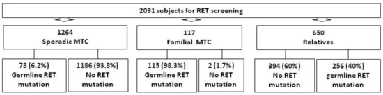 During the last 25 years (1993-2018), we have performed RET genetic screening in a total of 2031 Italian subjects: 117 were clinically affected by a hereditary disease at diagnosis, 1264 were affected by a sporadic MTC form (i.e., no familial MTC history and no other endocrine diseases), 650 subjects were relatives of RET positive MTC patients (Figure 1). Informed consent for RET genetic screening and other clinical procedures was obtained from all investigated subjects. The present study has been approved by the local ethical committee.