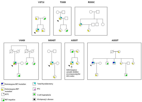 Pedigrees of MEN2 families with germline RET mutation classified as VUS. With the exception of a A883T RET mutated family in which medullary thyroid carcinoma (MTC) was present in two homozygous patients, MTC was present only in one member of the family. PTC: Papillary Thyroid Cancer.