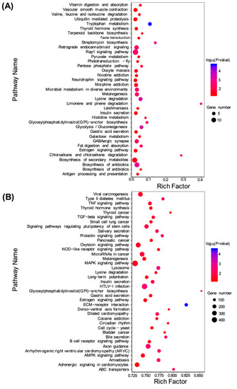 To identify the functional clusters and biochemical pathways of these DEGs, GO (gene ontology) enrichment analysis was performed by hypergeometric distribution testing. Based on the Nr annotation, 29,609 unigenes were assigned to 1739 GO terms. Using WEGO, 15,270 unigenes for the biological process category, 10,947 unigenes for the cellular component category, and 26,107 unigenes for the molecular function category were identified, respectively (Figure S2). Based on the analysis of DEGs and GO annotation results, GO enrichment analysis was conducted under the condition of p < 0.05. Here, we listed 21 GO terms for up-regulated DEGs and 24 GO terms for down-regulated DEGs, respectively. For the up-regulated DEGs, the most abundant GO terms were annotated to peptidase activity, heme binding, iron ion binding, and other terms (Figure 3A). For the down-regulated DEGs, the most abundant GO terms were annotated to molecular function, such as hydrolase activity, guanyl nucleotide binding, GTPase activity, nucleoside triphosphatase act, pyrophosphatase activity and GTP binding (Figure 3B).