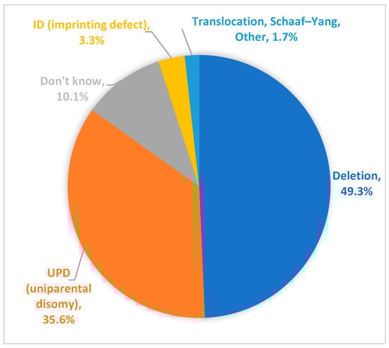 Of participants within the Registry who have a reported genetic subtype, 49.3% reported having PWS due to a paternal deletion and 35.6% reported having uniparental disomy (UPD) (Figure 3). Approximately 3.3% of participants reported having an imprinting defect. A small percentage of Registry respondents (1.7%) indicated that the participant fell into an “other” category. Open ended responses to a follow up question for “other” showed that these individuals include participants with PWS due translocations, atypical microdeletions, or “acquired PWS” (e.g., PWS-like symptoms subsequent to a hypothalamic tumor). In addition, a small number of participants (n = 2) in the Global PWS Registry have a diagnosis of Schaaf-Yang syndrome [], a PWS-related disorder caused by truncating mutations in the MAGEL2 gene, which resides in the PWS-region of chromosome 15. Genetic subtype is unknown for 10.1% of participants. These participants may have been diagnosed with PWS based on a clinical diagnosis only (more common in older participants), or they may have received a molecular diagnosis of PWS based on DNA methylation analysis only, without additional testing to discern genetic subtype.