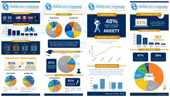 Infographics of Registry data shared with the PWS community. De-identified aggregate data is exported from the Registry, analyzed, and represented in infographics, and shared through social media, print newsletters, and other communications. Each infographic is designed to highlight a specific topic area of interest to PWS families, clinicians, and other stakeholders within the PWS community. Infographics and accompanying descriptions are available at https://www.fpwr.org/blog.