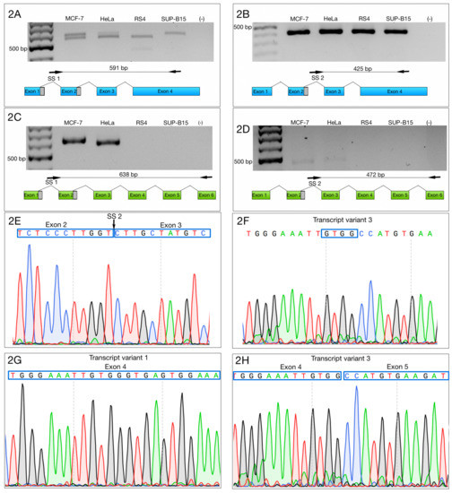 Selective amplification of ZNF695 alternative transcript variants. We selectively amplified the transcript variants of ZNF695. The black arrow and the black line indicate the sites of amplification and the PCR product size, respectively. The blue box indicates the full length of the long transcript of ZNF695 (TV1), the green box represents the short transcript of ZNF695 (TV3) and the grey box indicates the spliced region in the transcript. (A) Amplification of ZNF695_TV4 (591 bp) and ZNF695_TV5 (561 bp), which were co-expressed in the MCF-7 and HeLa cell lines. We observed that RS4 and SUP-B15 only expressed one variant, TV5 and TV4, respectively. (B) Specific amplification of ZNF695_TV5 of 425 bp in the four cell lines. (C) Amplification of ZNF695_TV6 (638 bp) in the MCF-7 and apparently HeLa cell lines expressed a preference for a TV7 of 608 pb. (D) Expression of ZNF695_TV7 (472 bp) was low in the MCF-7 and HeLa cell lines. We observed that in the HeLa cell line the amplified fragment showed bigger size than MCF-7. However, the sequences obtained from both fragments showed no difference. (E) Sequence of SS2 of the amplified ZNF695 transcript variants. The blue boxes show the boundary (exon 2–3) of the AS site. (F) Sequence that confirms the identity of ZNF695_TV3. (G) Partial sequence that confirms the identity of ZNF695_TV1 (NM_020394.5). (H) Partial sequence that confirms the identity of ZNF695_TV3 (NR_037892.1).