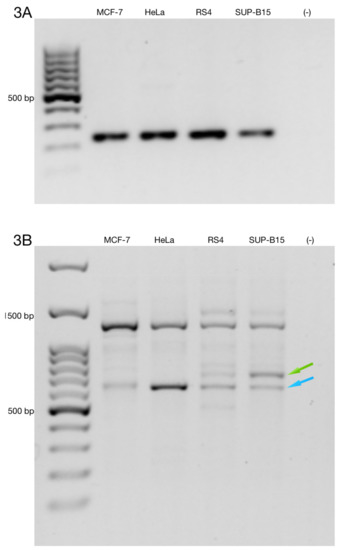 Rapid amplification of 3′ cDNA ends for the ZNF695 transcript variants expressed in the cancer cell lines. (A) Expression of the RPL4 housekeeping gene. (B) Co-expression of different amplicons of ZNF695. We observed two expected amplicons using the designed primers, as shown by the green and blue arrows; these amplicons correspond to ZNF695_TV6 and ZNF695_TV7, respectively.