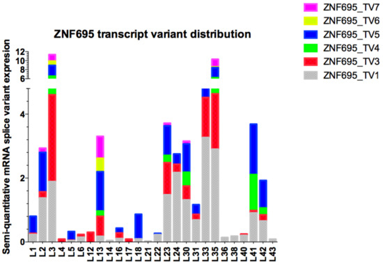 Expression of the different ZNF695 transcript variants varied widely among the samples, and ZNF695_TV4 and ZNF695_TV6 had the lowest expression levels in the patients. We then calculated the relative expression via densitometric analysis in ImageJ according to established parameters, with the housekeeping gene RPL4 as the reference gene. Heterogeneity was found in the relative expression levels of the transcript variants as well as in the expression ratios among all samples analyzed (Figure 7). Great diversity was identified in the co-expression patterns of the ZNF695 transcript variants.