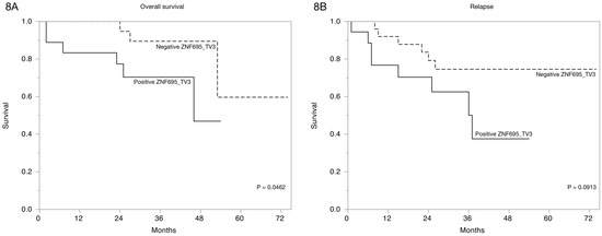 Finally, we estimated the overall survival of the patients via Kaplan-Meier curves based on ZNF695 transcript variant expression according to clinical characteristics Table 2. A significant association between overall survival and relapse and ZNF695_TV1 expression p = 0.0808 was not observed. However, the Kaplan-Meier curves based on ZNF695_TV3 expression revealed statistically significant differences in the overall survival and the tendency to relapse (Figure 8). These results showed that the expression of ZNF695_TV3 is associated with poor survival and increased tendency to relapse.