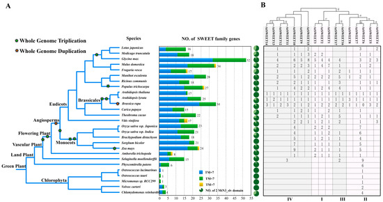 Molecular footprint and phylogenetical classification of SWEETs in the plant kingdom. (A) Identification and distribution of homologous SWEETs in different plants and (B) functional classification based on maximum likelihood (ML) phylogenetic analysis by Figure S1.