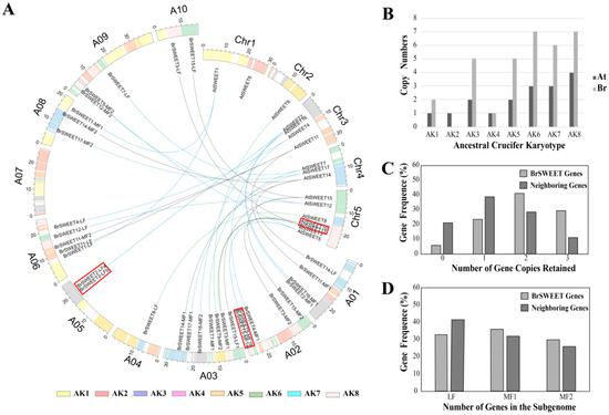 The genome release of B. rapa confirmed that, other than sharing the three paleopolyploidy events (γ, β, and α) with the genome of A. thaliana, B. rapa suffered an additional WGT event after the divergence from A. thaliana 13–17 million years ago [34,43,60,61]. The diploidization process to follow involved genome reshuffling and gene losses, which have different effects on the retention of the gene family set. To analyze the duplication and retention pattern of SWEETs in B. rapa, the orthologs or co-orthologs of SWEETs in A. thaliana were investigated. Here, a total of 33 BrSWEET genes were first identified in the B. rapa genome according to their syntenic relationship and a BLASTp search with the best-matched hits for A. thaliana homologs (Table S2) [5]. Each member was named on the basis of their orthologous relationship with A. thaliana and with co-orthologs in different sub-genomes by adding an LF, MF1, or MF2 suffix (Figure 2A). When mapping the SWEETs of A. thaliana and B. rapa onto 24 GBs of ancestral crucifer karyotype, all of them are mapped on 14 of the 24 GBs and they shared the selfsame GBs for orthologous genes distributed over eight ancestral crucifer karyotypes and expanding copies of AK1/3/5/6/7/8 in B. rapa (Figure 2B). By comparing them to the neighboring syntenic genes (10 genes on either side) in the flanking region, a higher proportion of BrSWEETs’ genes were retained for those homologs with two or three copies (Figure 2C), and more members were kept in the sub-genomes of MF1 and MF2 (Figure 2D).