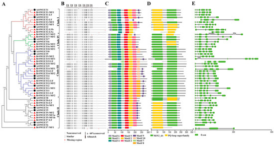 Sequence feature analysis of SWEETs in A. thaliana and B. rapa. (A) NJ-phylogenetic relationship, (B) sequence alignment of amino acid, (C) conserved motif, (D) conserved domain, and (E) exon-intron structure. The seven transmembrane™ domains were assigned a sequence alignment based on the AtSWEET1 structure indicated by Tao et al. [4].