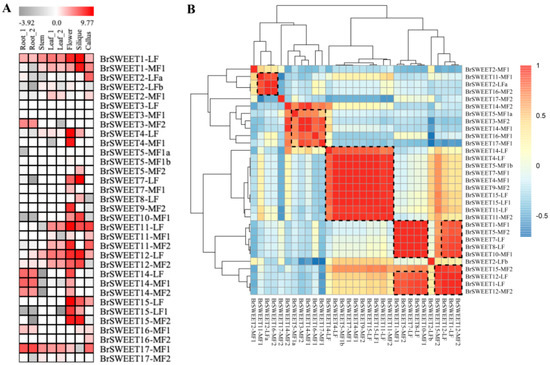 Heat map (A) and Pearson correlation coefficient (PCC) analysis (B) of the SWEET gene transcriptional levels in different tissues of Brassica rapa. The dotted black box indicates the members with transcriptional correlation. Blocks with colors (A) indicate low (dark) to high (red) normalized transcript accumulation and blocks, with colors in (B) indicating a negative PCC correlation (−1) to positive PCC correlation (1).