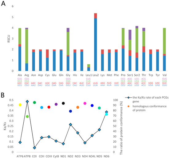 The relative synonymous codon usage (RSCU) reflects the phenomenon of codon usage bias in the genome [44]. Among the codons corresponding to each amino acid, A + T-rich codons have the highest codon usage rate in most amino acids, indicating a strong bias toward A + T-rich codons (Figure 3A). Additionally, the three most frequently used codons are UUA (4.91) for Leu2, CGA (3.18) for Arg, and GUA (2.41) for Val. We calculate the homologous conformance and the ratio of Ka/Ks for each of the PCGs (Figure 3B). Both H. sinicus and Damaster mirabilissimus mirabilissim belong to the Carabidae, and they share the ancestral genes in mitogenomes. So, Ka/Ks are evaluated using Damaster mirabilissimus mirabilissim as a reference. The COI gene has the highest conformance value of 95.9%, whereas the ATP8 gene exhibits the lowest conformance value of 68.5%. Most genes have values that exceeded 80%. The results indicate the evolutionary conservation of PCGs in mitogenome, which can also be observed in the calculations of the ratio of Ka/Ks. The Ka/Ks ratios for all PCGs are less than 1, indicating that these genes are evolving primarily under purifying selection [45]. The lowest Ka/Ks ratio for COI gene indicates strong purifying selection and evolutionary conservation in cytochrome c oxidase [46], which results in the COI gene often being used as a DNA marker [47]. On the contrary, the ATP8 gene has the highest Ka/Ks ratios, showing the highest evolutionary among PCGs, which implies that the ATP8 gene can be used to evaluate intraspecific relationships [48].