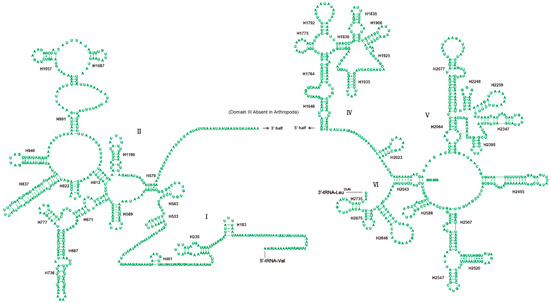 The rrnL and rrnS of H. sinicus are separated by tRNA-Val with no spacer or overlap found as shown in Table 1. The length of rrnL and rrnS is 1328 and 788 bp, respectively. The secondary structure of rrnL is drawn largely based on the insect model of Suwallia teleckojensis [22], and the rrnS is depicted largely based on the model of Panaorus albomaculatus [23]. Both RNAs contain many mismatched base pairs, most of them are G−U. The secondary structure of rrnL contains 45 helices and five structural domains (I, II, IV–VI) with domain III absent as in other arthropods [6,33,51] as shown in Figure 5. Compared with Suwallia teleckojensis, the structure of stems is more conserved than the loops, and the domains I, II, and IV are more variable than the domain V based on the alignment of sequences and secondary structure of rrnL. The secondary structure of rrnS contains 27 helices and three domains (Figure 6). Domain I is the most variable region based on the sequence similarity and secondary structure.