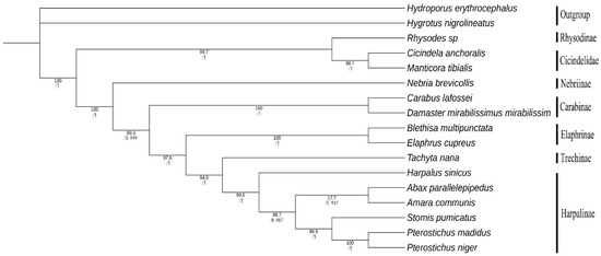 We conduct phylogenetic analyses based on 13 shared PCGs from 15 Carabidae species, and two Dytiscidae species are used as the outgroup as shown in Table S1. We use complete mitogenomes to evaluate the phylogenetic position of Harpalus within the Carabidae for the first time as shown in Figure 8. Most nodes in the ML and BI trees have high support values (bootstrap proportions ≥ 89.3, posterior probabilities ≥ 0.937), whereas nodes in the clade Abax + Amara have significantly low support values (17.7) in the ML analyses. BI and ML analyses provide identical topologies that Harpalus is an independent lineage and is closely related to four genera (Abax, Amara, Stomis, and Pterostichus) from the subfamily, Harpalinae. Five genera of Harpalinae are clustered as (Harpalus + ((Blethisa + Elaphrus) + (Stomis + Pterostichus))). In the Harpalinae, the following clades are consistent with a previous study [55]: Stomis + Pterostichus and Abax + Amara. Additionally, we recover the clade Blethisa + Elaphrus and confirm the placement of Rhysodinae as sister to Cicindelidae, as indicated by analysis of previous studies [56]. In our analyses, the clade of each subfamily within the Carabidae is strongly supported, but the position of each subfamily is incongruent with analyses from previous studies [55,56]. Unstable phylogenetic relationships may result from inadequate mitogenome data. We suggest that more mitogenomes are required to resolve the phylogenetic relationships within the Carabidae.