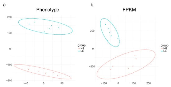 In this study, the RNA quality results are shown in Table S1 of the Supplementary Information; overall statistics of sequencing data we constructed from 12 cDNA libraries (six from HE small intestines, and six from LE small intestines). The sequencing generated, on average, 41,303,486 raw reads (20,651,743 paired reads) per sample. The raw reads were filtered and mapped to the Ss10.2 version of the pig genome (mapped rate, 79.89–82.78%). The analysis of the genes’ structure and distribution on the chromosomes of mapped reads are shown in Figure S1. Nearly 80% of read pairs mapped to exonic regions, 10% mapped to intronic regions, and the remaining 10% mapped to intergenic regions. The t-SNE analysis of the FPKM data of the two groups can clearly divide the individuals into two groups (Figure 1b). This result suggests that variations in gene expression patterns may cause phenotypic differences.