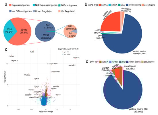 Counting and classification of differentially expressed genes (DEGs). (a,b) The pie chart displays the DEGs distribution among protein coding genes, long non-coding RNA (lncRNA), pseudogene, microRNA (miRNA), and other gene types. (c) Volcano plot of the DE genes with |log2(FoldChange)| > 1 and adjusted p-value < 0.01. The log2 Fold Change on the x-axis signifies expression difference, while the −log10 (p-value) on the y-axis indicates the significance of each gene. Red dots represent the 433 DE genes. Blue dots represent the remaining detected genes that did not meet the determined criteria. Dots with gene name annotations signify the 20 most significant DE genes. (d) The pie chart displays the distribution of 433 DE genes among protein coding genes, lncRNA, pseudogene, miRNA, and other gene types.