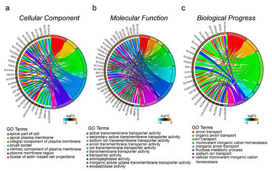 GO enrichment analysis results for the DEGs are shown in Figure 3. A total of 164 (37.88%) DEGs were annotated in the Gene Ontology database. GO analysis was performed for RNAs involved in cellular component (CC), molecular function (MF), and biological process (BP). The numbers of DEGs involved in these three categories were: 133 (30.72%), 135 (31.18%), and 120 (27.71%), respectively (Table S3). The genes enriched in these three classifications have a large overlap. In the CC category, there were two significantly enriched GO terms (Figure 3a)—the apical part of cell and the apical plasma membrane. Directed acyclic graphs (DAGs) are used to display the GO results. In these graphs, the relevance of the DE genes is illustrated by the branching pattern from top to bottom (Figure S2a). According to the DAG, the differential genes were mainly enriched in the composition of the cell membrane (Figure 3a and Figure S2a). Interestingly, all the differential genes enriched in the CC category were upregulated (Figure 3a), suggesting that cell membrane synthesis in the small intestine cells of the HE-group is more active. In the MF category, there were 43 significantly enriched GO terms (Table S3); the 10 most significant terms are shown in Figure 3b. The differential genes were mainly enriched in transporter activity, and the most significant term was active transmembrane transporter activity. According to the DAG, most of the differential genes were included in inorganic anion transmembrane transporter activity, solute:sodium symporter activity, ion antiporter activity, and inorganic solute uptake transmembrane transporter activity. There were 27 DEGs involved in the top 10 GO items, and all genes, except SLC22A20P, were upregulated (Figure 3b and Figure S2b). In the BP category, there were 16 significantly enriched GO terms (Table S3); the 10 most significant terms are shown in Figure 3c. These GO items were involved in single organism signaling, single-organism transport, and single-organism cellular process (Figure 3c). The most significant term was ion transport. According to the DAG, most differentially expressed genes were involved in organic anion transport, sodium ion transport, cofactor transport, monovalent inorganic cation homeostasis, and regulation of Ras protein signal transduction (Figure 3c and Figure S2c). There were two other signal transduction GO terms that had been enriched, Rho protein signal transduction and small GTPase-mediated signal transduction (Table S3).