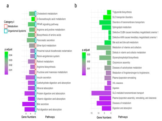 In the Reactome database, 189 DEGs had annotation information, which accounts for 43.65% of all DEGs. We identified a total of 28 significant pathways (Table S5). The top 20 pathways are shown in Figure 4b. There were nine disease-related or dysfunctional disorders in our enrichment results. The remaining 19 were classified into three categories: (1) Digestion and absorption: digestion and absorption; solute carrier (SLC) -mediated transmembrane transport; digestion and intestinal absorption. (2) Catabolism: metabolism of angiotensinogen to angiotensin; metabolism of vitamins and cofactors; bile acid and bile salt metabolism; sphingolipid metabolism; fructose catabolism. (3) Fat transport and synthesis: plasma lipoprotein assembly, remodeling, and clearance; HDL clearance; plasma lipoprotein clearance; glycerophospholipid biosynthesis; triglyceride biosynthesis.