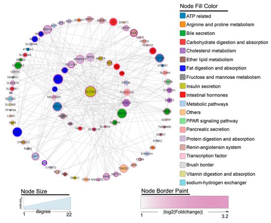 Protein-protein interaction (PPI) network constructed by the Search Tool for the Retrieval of Interacting Genes (STRING) database for DEGs. The two-level gene network relationship of the hub gene (SLC2A2) with the highest degree as the center. Node size indicates the degree of each gene. Node border color represents the fold change in gene expression. Node color represents the functional classification of the gene.
