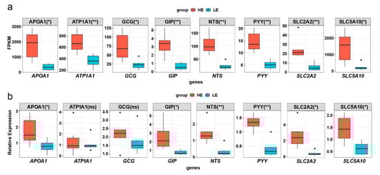 Quantitative real time polymerase chain reaction (qPCR) validation of eight DE genes. (a) Boxplot of FPKM expression values for the eight DE genes in RNA-seq. The y-axis represents the FPKM expression level, and the x-axis represents the gene name. The color of boxplot represents either the extremely high feed efficiency (HE)-group (red) or extremely low feed efficiency (LE)-group (blue). (b) Boxplot of the APOA1, ATP1A1, GCG, GIP, NTS, PYY, SLC2A2, and SLC5A10 relative expression levels normalized to ACTB. * represents p-value < 0.05 in the HE-group compared with the LE-group. ** represents p-value < 0.01 in the HE-group compared with the LE-group.