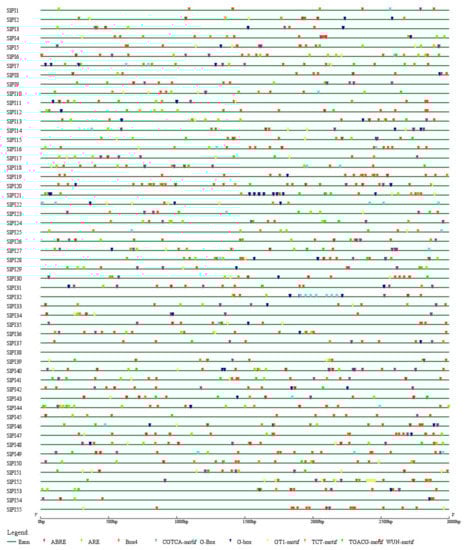 Identified cis-elements in the promoters of SlPI genes. The green line represents the upstream of the SlPI gene. Different colored wedges represent different cis-elements. The length and position of each SlPI gene are drawn to scale. Scale bar indicates DNA sequence length.
