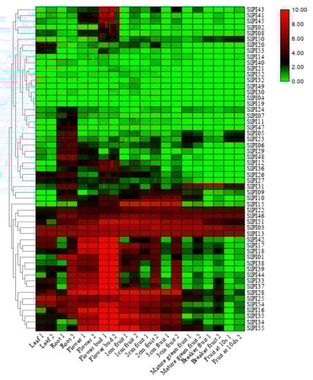 Heat map of the expression patterns of SlPIs in 10 tissues/stages. The RNA-seq expression data of 10 tissues were used to reconstruct the expression patterns of SlPI genes. The samples were obtained from the leaf, root, flower, flower bud, 1, 2, and 3 cm fruit, mature green fruit, breaker fruit, and fruit at 10 days. Heat map is presented in green/black/red colors that represent low/medium/high expression, respectively.