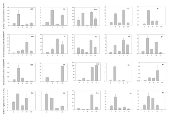 As shown in Figure 8, SlPI03 and SlPI54 decreased immediately after reaching the peak, whereas the expression levels of SlPI04 and SlPI55 increased first and then slowly decreased under ABA treatment. Under SA treatment, the expression levels of all three PI genes (SlPI03, SlPI04, and SlPI54) increased, but that of SlPI55 decreased. Notably, the SlPI54 levels dramatically increased by approximately 30-fold after 1 h of Eth treatment, which indicated that Eth can promote the expression of SlPI54. After GA induction, SlPI54 and SlPI55 reached the maximum level at 4 h, whereas SlPI03 and SlPI04 were expressed very similarly, with high expression at 4 and 12 h. After 24 h of MV treatment, the expression levels of all four PI genes were almost zero, indicating that MV treatment inhibited the expression of most PI genes. In short, hormones can significantly regulate the expression of PI genes, indicating that the PI gene plays an important role in abiotic response.