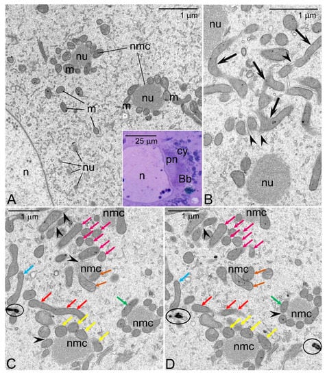 - It is well known that in the ovaries of both vertebrates and invertebrates, a relatively large fraction of young germline cells is eliminated via apoptosis [53,54,55,56]. We believe, in this context that the selection of the mitochondria in oocytes is a two-step process: The first step operates at the cellular level and involves selection of mitochondria and mtDNA variants. In the second, all the germline cells that still (after the first step) contain large number of mutated mtDNA are eliminated via apoptosis. This idea is in line with our EM analyses showing that in apoptotic oocytes of Thermobia, the Bbs mitochondria reveal highly altered morphology (Figure 1C).