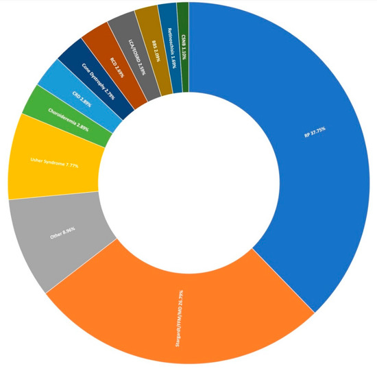 To date, over 270 genes have been associated with a wide variety of IRDs across a phenotypic spectrum [6], which are routinely divided into large subcategories in order to readily distinguish the specific retinal regions and cell types affected; for example, retinitis pigmentosa (RP) versus macular dystrophy, which initially cause predominantly peripheral and central vision loss, respectively. In the majority of IRDs, ocular manifestations occur in isolation. However, many forms of syndromic IRD that result in systemic disease have also been described [7]; more common forms include Usher Syndrome and Bardet-Biedl syndrome. RP is the most frequent IRD presentation with an incidence of approximately 1 in 3000 [8]. Over 70 genes are implicated as causative of RP, making it one of the most diverse and genetically heterogeneous Mendelian conditions described to date [9]. Other IRDs are less heterogeneous—autosomal recessive Stargardt disease, for example, which is caused by pathogenic variations in ABCA4 in approximately 95% of cases [10,11,12,13]. Furthermore, IRDs such as X-linked retinoschisis are characterised by a single gene aetiology [14].