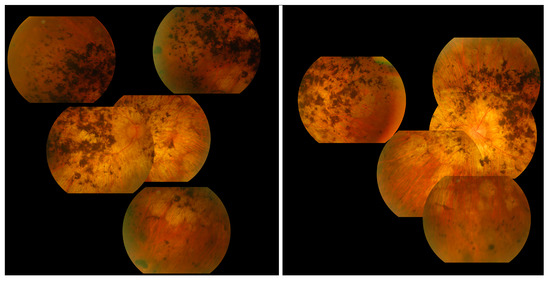 Collage of fundus images of a patient initially presenting with a Stargardt phenotype that progressed to phenotype suggestive of retinitis pigmentosa. Extensive pigmentation can be seen at both maculae and also in the periphery of both eyes (left—right eye, right—left eye). There are also distinct punched-out areas in the pigment epithelium bilaterally.