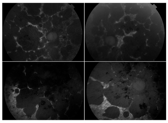 Montage of autofluorescence fundus images of the patients initially presenting with a Stargardt phenotype that progressed to phenotype suggestive of retinitis pigmentosa. The right eyes are shown in the left column; the left eyes are shown in the right column. Patient example 1 is the first row and patient example 2 is the second row. All eyes demonstrate a dark choroid and large nummular regions of hypoautofluorescence throughout the retinae.