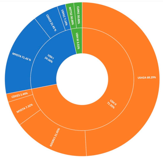 Usher syndrome is the most common manifestation of syndromic-IRD in this cohort, accounting for over 7% (78/1004) of all clinical presentations in Target 5000 (Figure 1). Usher syndrome is a form of ciliopathy characterised by RP and sensorineural hearing loss. It is generally divided into sub-groups based on severity of symptoms, ranging from most severe in Type 1 to least severe in Type 3. In total 57 pedigrees were genetically diagnosed with Usher syndrome, where 2 candidate variants were detected, with Type 2 being the most common presentation. Seventy-eight pedigrees were clinically diagnosed with Usher syndrome, yielding a positive candidate detection rate of 73% (57/78). Usher type 2 is by far the predominant sub-group in the Target 5000 cohort (41/57), most frequently caused by variants in USH2A (28/41) (Figure 7). Variants in MYO7A were the most frequent cause of Usher type 1 (10/14). Variants in CLRN1 and MTTS2 (1/2) contributed equally to cases of Usher Type 3 in this study, with one individual carrying a novel candidate variant in CLRN1 (Table 2).