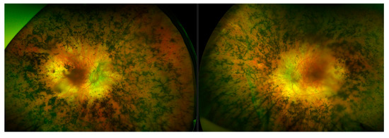 Typically, variants in FLVCR1 have been associated with a neurological syndrome, posterior column ataxia with retinitis pigmentosa (PCARP; MIM: 609033) [39,40,41], and more recently a specific splice variant (c.1092 + 5G>A) has been reported multiple times to be associated with non-syndromic RP [42,43,44]. Through Target 5000, substantial evidence has been obtained that suggests the first incidence of a protein coding FLVCR1 variant c.1022A>G (p.Tyr341Cys) implicated in non-syndromic RP [45]. RP is the most common clinical diagnosis for participants in the Target 5000 study, where the clinical diagnosis of RP accounts for nearly 40% (379/1004) of total pedigrees enrolled to date (Figure 1). Patients with this variant present with typical RP, without any extraocular features (Figure 10). Since its initial detection, this variant has been observed and deemed to segregate with the condition in three additional not knowingly related families in the Target 5000 cohort. Each of the genotyped affected individuals in these three pedigrees are homozygous for this variant.