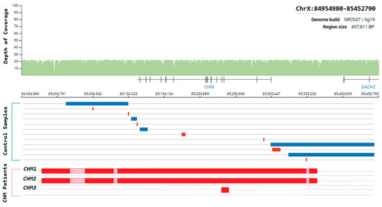 Schematic representation of the genomic region surrounding the CHM gene. Whole-genome coverage data from a control population database (https://gnomad.broadinstitute.org/). Structural variants detected from controls samples and Target 5000 patients are aligned to this region to illustrate the instability of this genomic region. Blue = duplication, Red = deletion, Pink = template positive results likely due to highly similar sequence elsewhere in the genome.